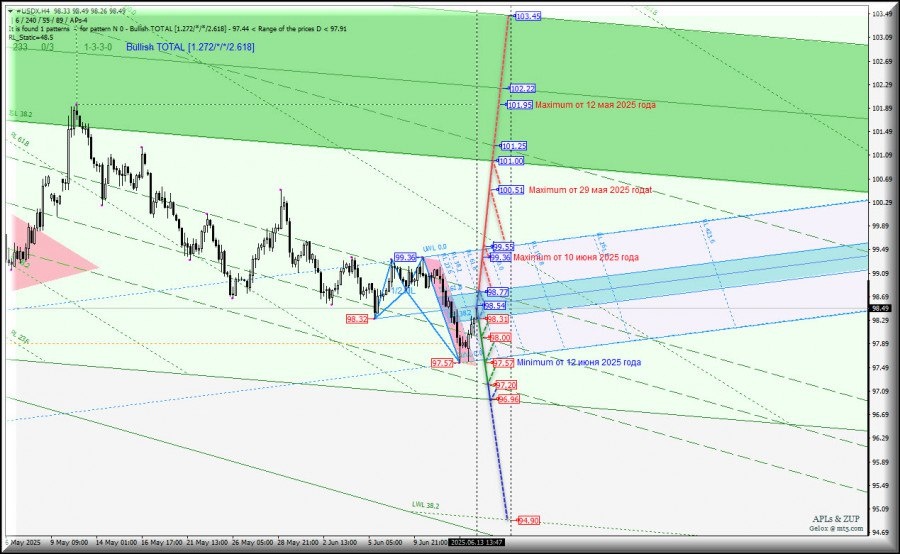 https://basechop.ru/wordpress/?p=46279 Операционный масштаб Minute (таймфрейм h4) #USDX – h4 – обзор вариантов движения с 16 июня 2025 г. Предыдущий обзор US Dollar Index (таймфрейм h4) от 11.06.2025 г. 14:41 ____________________ US Dollar Index Движение #USDX с 16 июня 2025 года будет обусловлено границами канала 1/2 Median Line (97.20 – 98.00 – 98.77) вил старшего операционного масштаба Minuette-h1 и данное движение продолжится в соответствии с отработкой и направлением пробоя границ зоны равновесия (98.31 – 98.54 – 98.77) вил младшего операционного масштаба Minuette-h1. Восходящее движение. При пробое достаточно сильного уровня сопротивления 98.77 на пересечении верхней границы ISL61.8 зоны равновесия вил младшего операционного масштаба MInuette-h1 с верхней границей канала 1/2 Median Line Minute-h4 восходящее движение индекса доллара может быть продолжено к maximum 99.36 от 10 июня 2025 года и к конечной линии FSL Minuette-h1 (99.55), а если данные уровни не остановят #USD