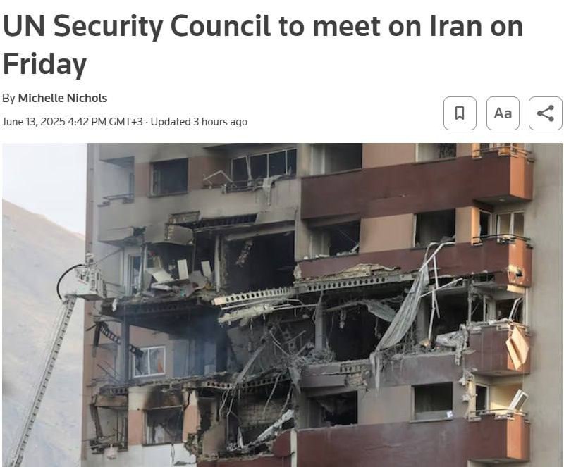 Совет безопасности ООН созывается на экстренное заседание из-за серии ударов Израиля по иранским ядерным и военным объектам. Об этом сообщает Reuters. Анонимные источники издания сообщили, что сегодня вечером Совет безопасности будет заседать по поводу ударов Израиля по Ирану. Министр иностранных дел Ирана Аббас Арагчи ранее сегодня обратился с просьбой о проведении встречи в письме в орган, заявив, что Израиль "пересек все красные линии, и международное сообщество не должно позволить этим преступлениям остаться безнаказанными". Тем временем в повестке дня Совбеза ООН сегодня появилось запланированное событие, касающееся Ближнего Востока. 👊 НАСОНОВ 🔴