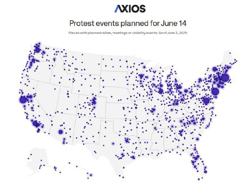 В США ожидаются масштабные митинги против Трампа Более 100 ориентированных на Демпартию организаций собирают массовые протесты против Трампа по всей стране, сообщает Axios. По данным портала, протесты состоятся 14 июня в 1800 городах 50 штатов, акция будет называться «No Kings». Также международные митинги запланированы в Колумбии, Малави, Италии, Португалии, Германии и Британии. В этот день Трамп в Вашингтоне устраивает масштабный военный парад, приуроченный к его дню рождения и 250-летию армии США. 👊 НАСОНОВ 🔴