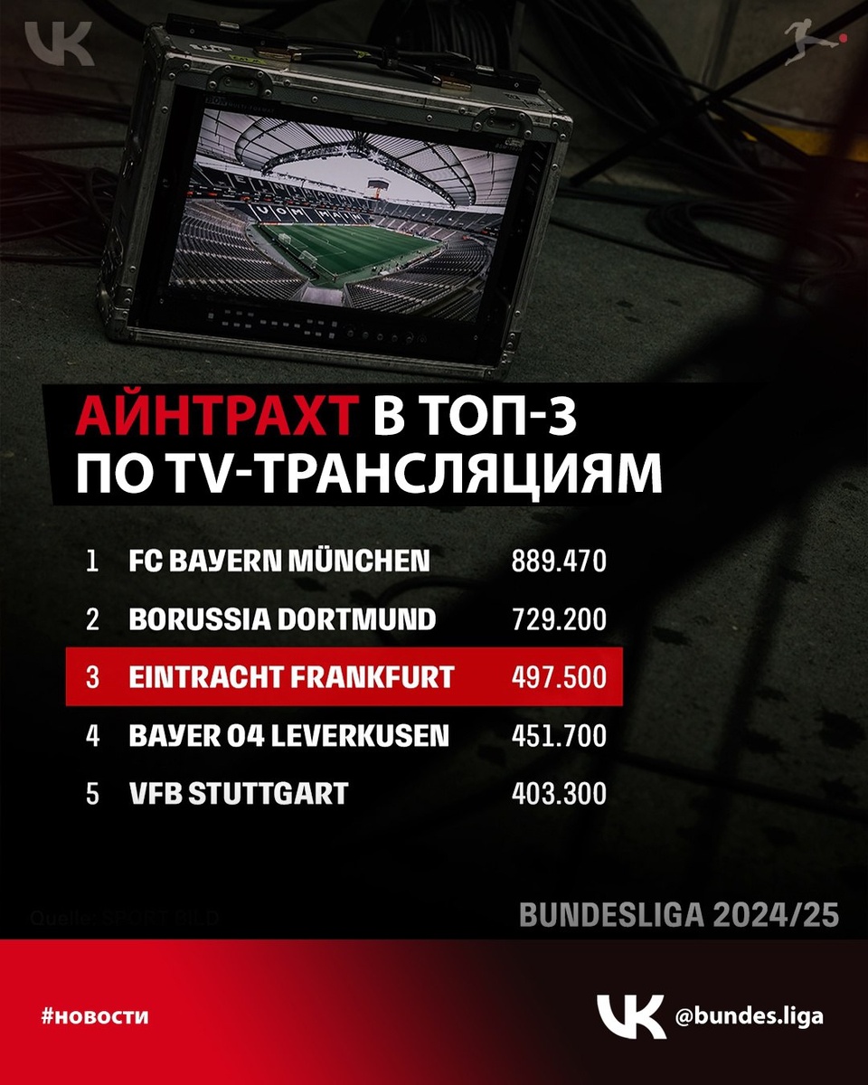 Прошедший сезон Бундеслиги вызвал большой интерес к играм "Айнтрахта" по ТВ! 📺 Клуб из Франкфурта вошёл в тройку по зрительской tv-аудитории, обойдя такие популярные клубы как "Байер" и "Штутгарт". В рейтингах переключателей сигналов ТВ в Германии традиционно считаются показы трансляций и интерес аудитории во время матчей клубов. Таким образом, в сезоне 2024/2025 Бундеслиги "Айнтрахт" уверенно вошёл в тройку ТВ-трансляций. В среднем почти 500 000 зрителей за игру 🥉 Достойно! Поздравляем 👏