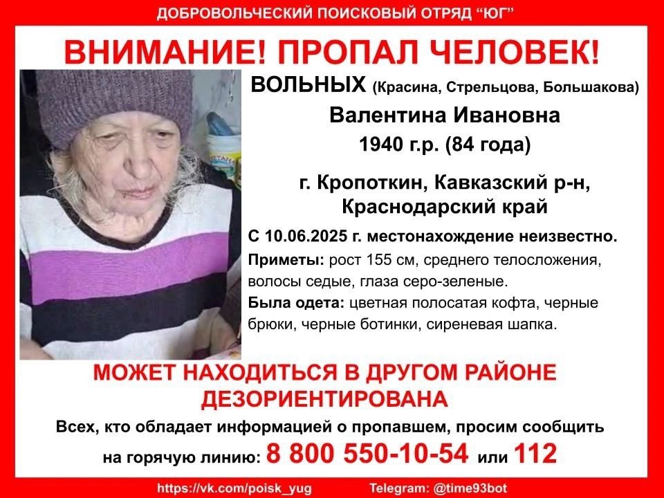 Внимание! Пропал человек! #Вольных (Красина, Стрельцова, Большакова), 1940 г.р., (84 года) г. #Кропоткин, #Кавказский р-н, Краснодарский край. С 10.06.2025 г. местонахождение неизвестно. Инфорг поиска: Юлия 89528724228 Всех, кто обладает информацией о пропавшем, просим сообщить по телефону бесплатной горячей линии 88005501054 или 112. Если вы готовы помогать в поиске пропавших без вести, приглашаем присоединиться к телеграм-чату оповещения: t.me/poisk_193