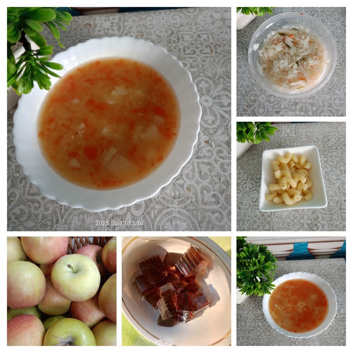 Завтрак - гороховый суп; капуста квашеная; макароны вместо хлеба поштучно.