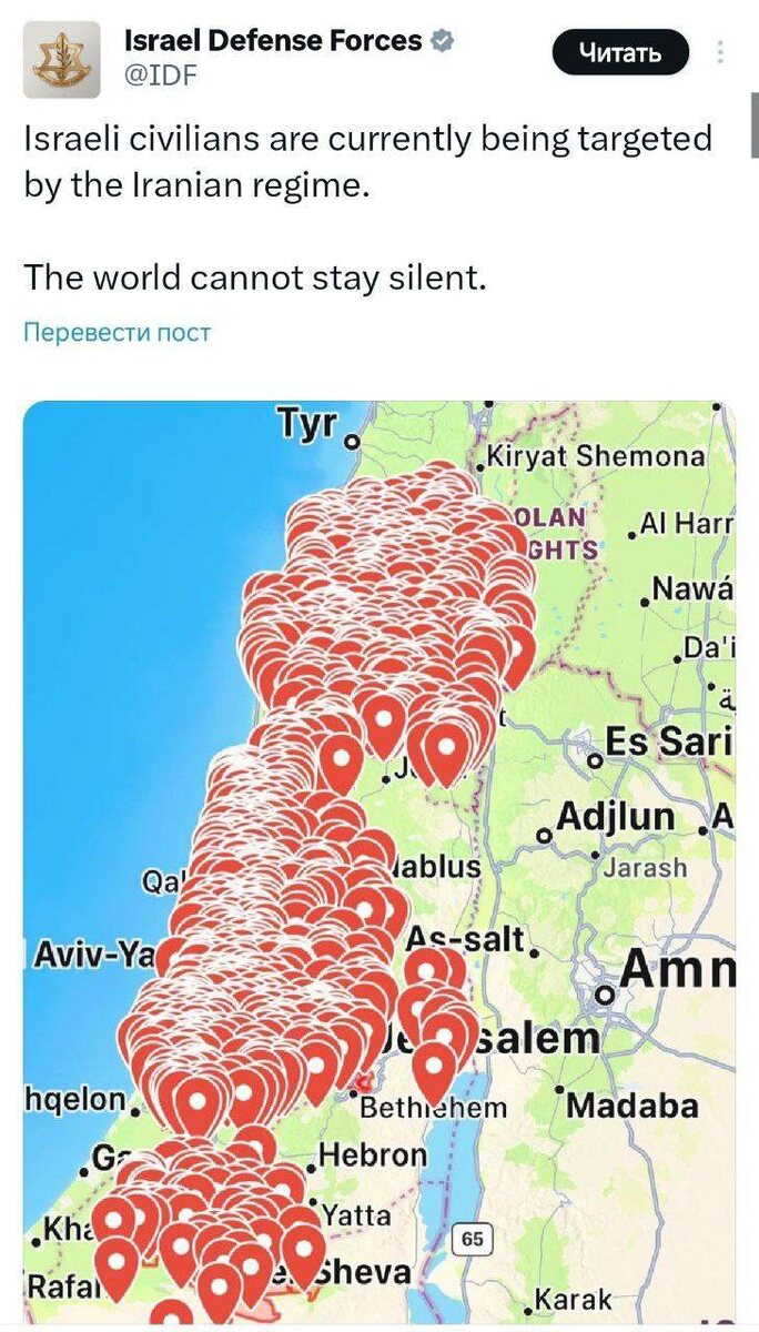 🇮🇷🇮🇱 «Израильские граждане в настоящее время подвергаются нападениям со стороны иранского режима. Мир не может молчать», - заявляет министерство обороны страны, которая устроила геноцид палестинцев не фоне мирового молчания.