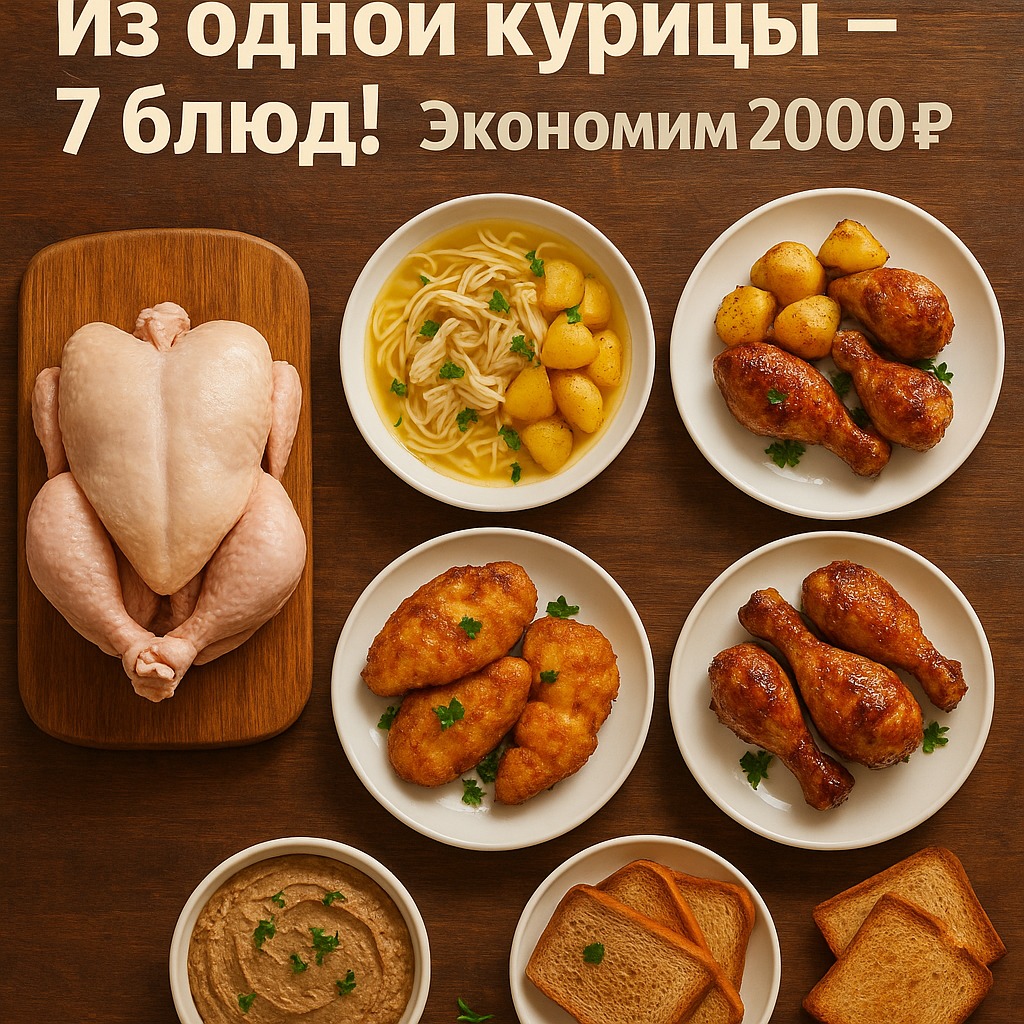 Друзья, сегодня я вас научу магии! Магии превращения одной курицы в 7 совершенно разных блюд. Звучит как сказка? А это реальность моей кухни! Покупаю курицу за 300 рублей, а получаю блюда на всю неделю. Вместо того чтобы тратить по 400 рублей в день на мясо, трачу 43 рубля! Экономия — 2500 рублей в неделю. На эти деньги можно купить продуктов еще на неделю! Рассказываю пошагово, как разделать курицу и что из каждой части приготовить. Из одной курицы получаем: Лайфхак: Не умеете разделывать? Попросите в магазине — многие делают это бесплатно! Из чего: Спинка, шейка, крылышки