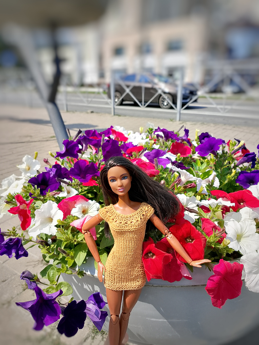 В пятницу с утра поехала в очередной ТЦ обзор делать, взяла с собой Мику: пофотать среди города. Как раз платьишко ей связала, правда, получилось неважно, однако ссылку оставляю: Неудача – моя личная вина, есть у меня такой недостаток: я НИКОГДА не делаю образец. Вяжу я всегда туго, спицы тонкие. Не платье, а тунику на выходе получила))) С обзором тоже не вышло: перед поездкой по магазинам я обычно гуглю, продаются ли в местах предполагаемого посещения игрушки. Ну, инет нагуглил мне, что продаются. А оказалось, что это устаревшие данные были, и больше отдела игрушек в этом Сани-Марте нет🤷♂️ Сделала пару фоточек Мики на улице возле петуний👇 И несолоно хлебавши поехала домой. Зато к вечеру мы поехали на пляж на Барковку, на Суру. И чтобы аннулировать утреннюю неудачу, снова взяла с собой Мику. Хотя наряд у неё совсем не пляжный, конечно😅 Ну и дальше будут просто фоточки))) Мика, в отличие от меня, не купалась, но мне очень понравился сам образ смуглой черноволосой девушки в песка