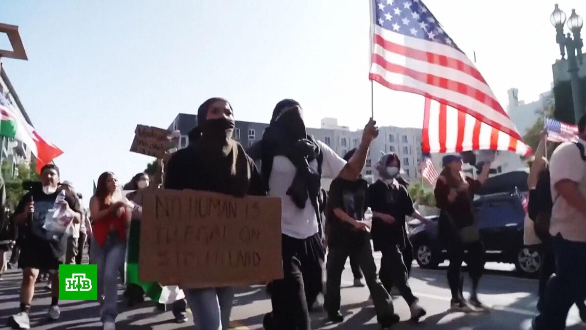 [ Смотреть видео на сайте НТВ ] В США расширяется география протестов. Уже неделю в американских городах жители выходят на улицы. Они выступают против планов властей по депортации нелегальных мигрантов. Несмотря на некоторое затишье в последние сутки, власти Техаса и Миссури мобилизуют нацгвардию и готовятся противостоять провокациям. Завтра в США запланирована крупнейшая протестная акция. Седьмой день протестов в Америке против действий миграционной службы снова вывел тысячи людей на улицы Лос-Анжелеса, Нью-Йорка, Чикаго, некоторых других городов, однако протестующих было намного меньше, чем раньше. Наткнувшись на жесткий отпор властей, протесты немного сбавили обороты. Возможно, это затишье перед бурей. В субботу, 14 июня, по всей Америке митингующие хотят устроить акцию гражданского неповиновения. Массовые выступления запланированы сразу в полутора тысячах населенных пунктов. Так называемый «День без королей». Имеется ввиду, что без Трампа. Дональд Трамп, президент США: «Я не чувств