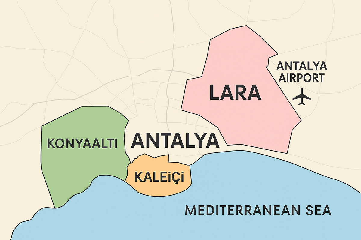 - Лара — фешенебельный район с песчаными пляжами, пятизвёздочными отелями и близостью к аэропорту. Местная «отельная зона» считается одной из самых роскошных в Турции. Отлично подойдёт тем, кто ценит высокий уровень сервиса, хочет жить «всё включено» и не тратить время на долгие трансферы.