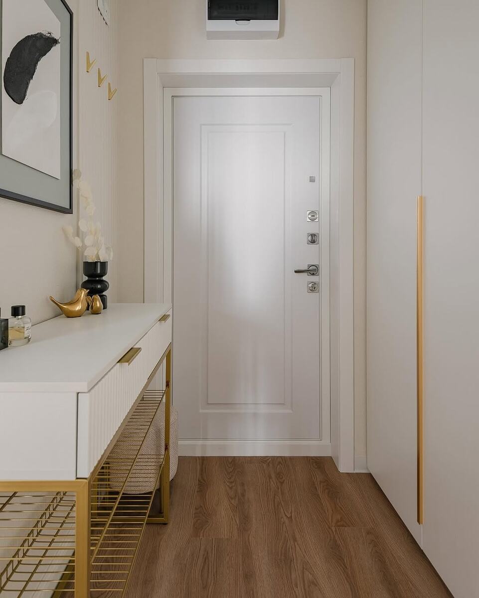 Интерьер, где каждый сантиметр — на своём месте Этот проект — прекрасный пример того, как небольшое пространство может быть одновременно функциональным, уютным и эстетически выверенным. В квартире площадью 53 кв.м нет ничего лишнего — только тщательно подобранные цвета, лаконичные формы и выразительные акценты. Всё подчинено главной задаче: создать комфортную и красивую среду для жизни. Белоснежные фасады кухни без ручек создают ощущение воздушности и чистоты. Контрастные вкрапления — встроенная техника чёрного цвета и тёмные акценты на фурнитуре — добавляют графичности и строгости. Матовое покрытие фасадов и керамогранит с мраморной текстурой на фартуке подчеркивают сдержанную элегантность. Отдельное внимание заслуживает смеситель: его латунный блеск органично сочетается с подвесными светильниками, ножками мебели и другими золотыми деталями, объединяя весь интерьер в единую визуальную систему. Столовая зона — это сердце квартиры. Стол с лаконичной белой столешницей и тонкими чёрным