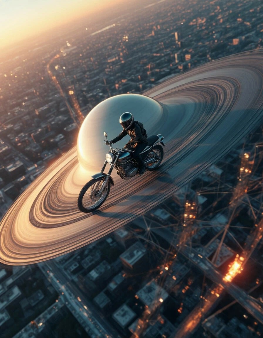 Опять 2 картинки с легка измененным промптом. geometric composition, wind-blown macro Saturn with reflective surface, inside Saturn female motorcyclist (close-up) flies along the ring, reflection of environment on Saturn with precise geometric distortions, shooting angle 30°, no traces of render, hyper-detailed fog, partially transparent, traffic lights in a metropolis from a bird's eye view are visible through segments, background abstract air structures clouds, smoky swirls, backlight, depth of field, professional photo, ultraHD #neuroart #нейроарт #ai #ии #нейросеть #картинки #искусственныйинтеллект #цифровоеискусство #digitalart #арт #art #prompt #промпт #подсказка