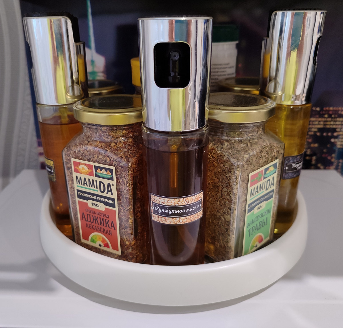 Ну, а для тех, кто видео не смотрит, сделала фоточку с крутящимся подносом для кухонных баночек с бутылочками ⤵️