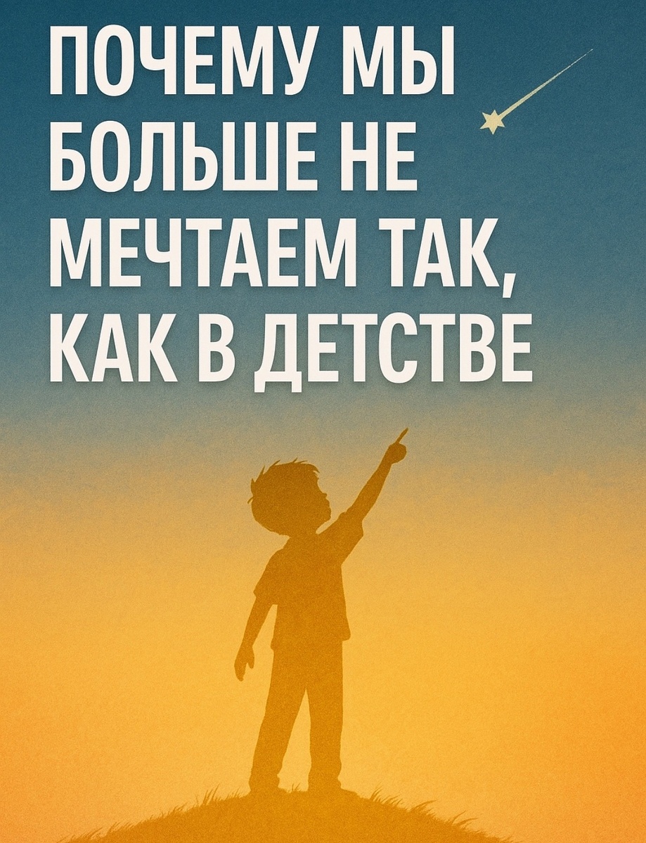 Когда мы были детьми, мечтать было естественно. Мы легко могли представить себя астронавтами, певцами, волшебниками или путешественниками. Мы не думали о деньгах, возрасте, уместности. Мы просто мечтали. Теперь мы взрослые. Мы строим планы, составляем графики, говорим о целях. Но мечта по-настоящему, свободно, широко уже почти не умеем. Почему? ⸻ Детство - территория без границ У ребёнка нет фильтров. Он ещё не знает, что «так не бывает». Мечта - это игра, фантазия, исследование. Он не думает, что «слишком стар», «слишком глуп» или «слишком беден». В мечтах - всё возможно. Когда нам 5, мы хотим летать. Когда 10 быть известным художником. Когда 12 покорить мир. Никто не объяснил, что мир скажет «нет». Мы просто хотим и это хотение наполняет нас жизнью. ⸻ Что происходит дальше? Постепенно мечты заменяются на установки: - Будь реалистом. - Надо выбирать профессию по деньгам. - Ты не потянешь. - Это не для тебя. Нам говорят, что есть «настоящая жизнь», а мечты - для наивных. Что надо идти