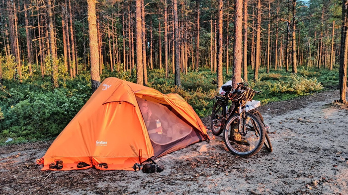 День 44 (Республика Карелия, о.Ладожское). Вечер вчерашнего дня опять смог нас удивить и порадовать. В десять часов закатное солнце вновь прорвалось сквозь серую вату туч, висящих над горизонтом, подарив нам часок оранжевого настроения. Оранжевое море, оранжевое небо, оранжевые сосны, оранжевый отчёт. Оранжевая Ира в оранжевой палатке, оранжевый сухарик оранжево грызёт. Засыпали под моросящий дождь. Капли воды, подобно рисовым зёрнам, мелкой дробью шуршат по тенту палатки. Этот же шорох я слышу сквозь сон и утром, совсем ранний подъём отменяется, вся надежда на ветер, взбаламутивший озеро, он должен угнать и висящие над нами тучи. Стартуем около девяти. Не так рано, как хотелось, но зато на небе сияет солнце, а ещё мы как раз успеваем к открытию магазинов в посёлке, рядом с которым стояли. Дальше по маршруту глушь до самой Ладоги, а это сто с лишним километров, которые мы собрались сегодня преодолеть со свежими силами. Первые километров сорок едем легко, практически не напрягаясь. Солн