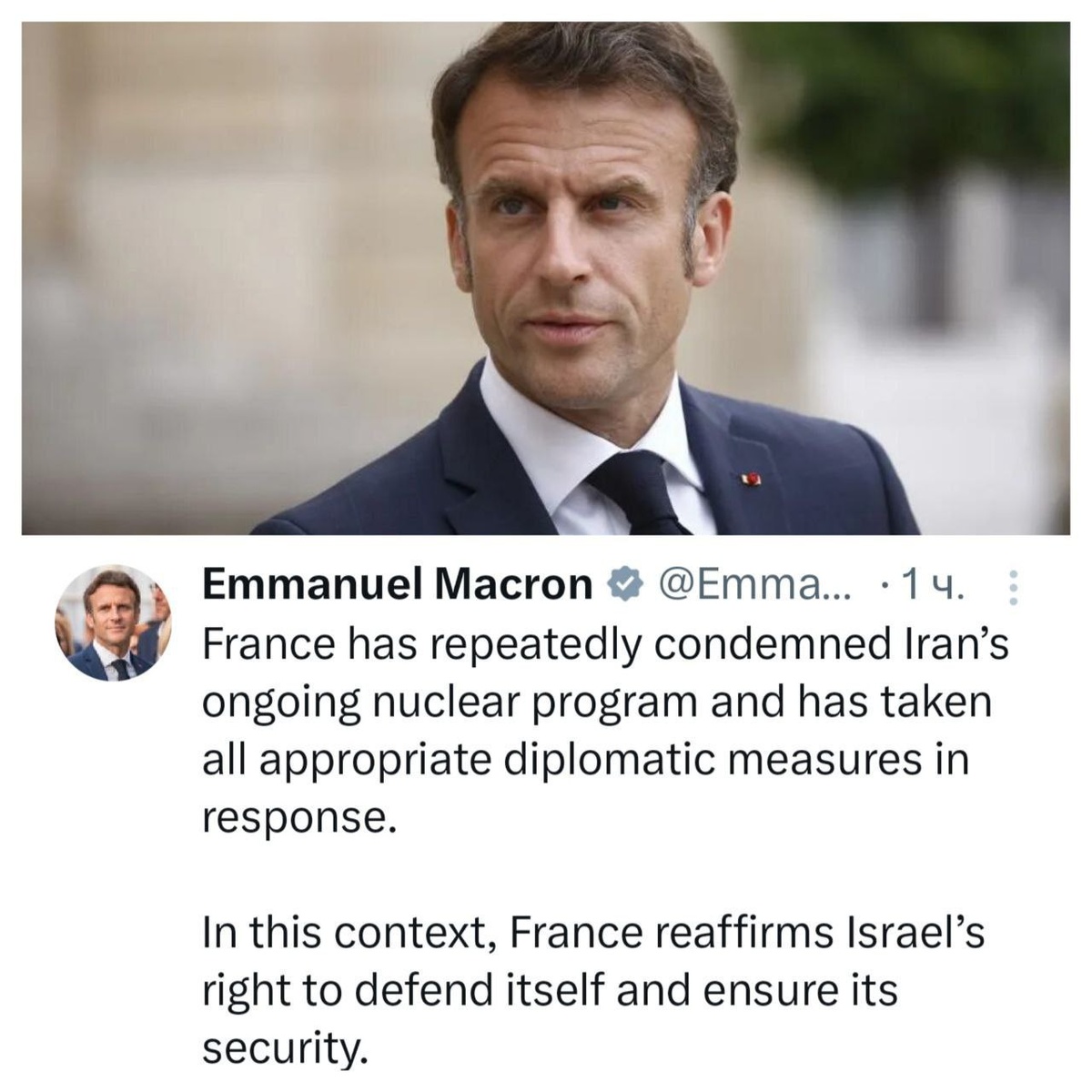 Israele ha il diritto all'autodifesa e a garantire la propria sicurezza, ha affermato Macron. Ha ricordato che Parigi ha ripetutamente condannato il programma nucleare iraniano e ha preso tutte le misure diplomatiche necessarie per contrastarlo.