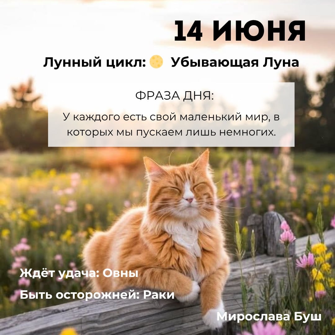 14 июня РЕКОМЕНДАЦИИ: ⭐️ Хороший день, чтобы очистить пространство. Наведите порядок в доме и у себя в саду, если он есть. ❌ Новые знакомства в этот день ничего хорошего не принесут. Разве что в самых редких случаях. но лучше не рисковать. 🛡 Если в Убывающую Луну часто чувствуете тревогу, одолевают негативные мысли — это знак, что вам не хватает опоры. У вас слишком много нерешенных дел, а сил на их решения банально нет. Чтобы их восстановить, обратитесь к Роду за помощью или носите амулеты для защиты от того, что эти силы у вас крадёт. ✉️ Подписаться на Мирославу #прогнознадень