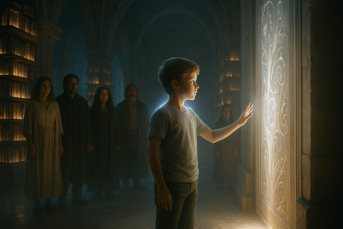 На пороге стоит Тарвис. Его фигура окутана лёгким серебристым ореолом, не потому что он маг, а потому что сама магия в этом месте тянется к нему. Он не светится — свет раскрывает его. Его лицо спокойно, но не по-детски. Он оборачивается к матери — и в этом движении нет ничего от мальчика. Взгляд его — не взрослый, не мудрый, не отрешённый. Это взгляд сущности, пробуждённой к знанию. В нём нет вопросов. В нём нет растерянности. Там — ясность. Не как у знающего, а как у того, кто теперь сам является частью знания.