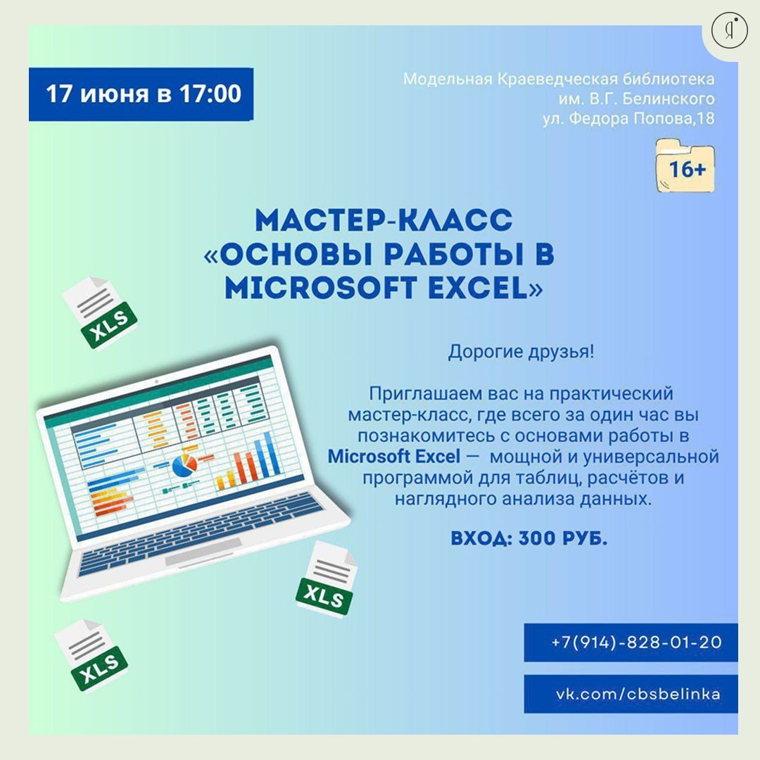 Мастер-класс «Основы работы в Microsoft Excel» 16+ #МК Всего за один час вы познакомитесь с основами работы в Microsoft Excel — 🧮 мощной и универсальной программой для таблиц, расчётов и наглядного анализа данных. Что вы узнаете: - Как устроен интерфейс Excel: ячейки, листы, строки и столбцы; - Как вводить и форматировать данные; - Как использовать простые формулы и функции (СУММ, СРЗНАЧ и др.); - Как сортировать, фильтровать и анализировать таблицы; - Как создавать простые и наглядные диаграммы 17 июня | 17:00 Краеведческая библиотека им. В.Г. Белинского, Ф.Попова, 18 300 руб. Строго по записи - +79148280120 Online Якутия | Подписаться