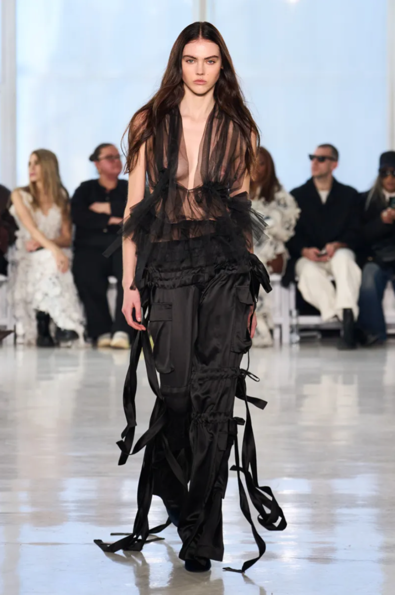 За плечами Нильсена — Galliano, и это чувствуется в нарочито беспечном кутюре, в платьях из тюля с лентами, которые завязаны так, будто их собирали на бегу — буквально. Как будто модель услышала сирену тревоги и успела схватить только платье и драму.