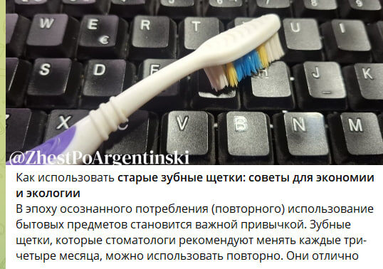В эпоху осознанного потребления (повторного) использование бытовых предметов становится важной привычкой. Зубные щетки, которые стоматологи рекомендуют менять каждые три-четыре месяца, можно использовать повторно. Они отлично подходят для чистки труднодоступных мест: клавиатур, пультов, швов между плитками и плинтусами, а также укромных уголков кранов и бытовой техники. Раскрывшиеся щетинки можно вернуть в форму, опустив щетку в горячую воду. Зубная щетка также полезна в уходе за собой и домашними животными: как скраб для губ, расческа для бровей или инструмент для чистки лап и шерсти животных. Перед повторным использованием для ухода за кожей щетку следует продезинфицировать горячей водой и антисептиеом ()