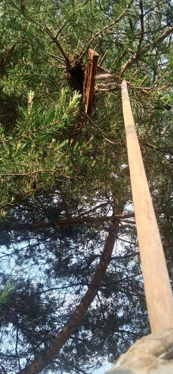 Занимаюсь огородными делами и слышу вдалеке звук пчелиного🐝 роения😳 Побежал к ульям- и точно- рой сходит! Повис на ветке сосны метрах в 5+ над землёй. И с дерева до него не добраться😳. Принёс лестницу и с неё с помощью подручного инструмента и рамки с сушью снял рой. Долго конечно это всё, но вовремя среагировал и сохранил роëк). Первый раз. А эмоций- вагон и маленькая тележка)