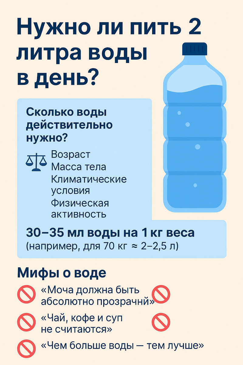 (например, для 70 кг — около 2–2,5 л всей жидкости, включая еду и напитки) Пить воду — важно. Но слепо следовать цифре 2 литра — не нужно. Ориентируйся на сигналы тела, климат, активность. Пей по жажде, и будь внимателен к себе. Подписывайся на “Красота и здоровье” — простые и полезные советы о теле, еде и жизни без перегруза.