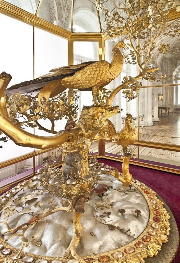 Павлин» — часовой автомат, который входит в постоянную экспозицию Павильонного зала Малого Эрмитажа. История появления «Павлина» в Петербурге туманна. Есть несколько версий: По другой, «Павлина» приобрела сама Екатерина II в подарок фавориту, заплатив мастерам Джеймсу Коксу и Фридриху Юри огромную по тем временам сумму в 11 000 рублей золотом. Часы «Павлин» — визитная карточка Эрмитажа. Более 200 лет они украшают Павильонный зал музея. Это не просто часы, а сложная многофигурная композиция с уникальным механизмом. Она олицетворяет закономерности природы, а именно — смену дня и ночи. В центральной части композиции находится дубовый пень, покрытый листьями. С ним соседствуют лесные жители: белки, грибы и растения. На пне возвышается величественный павлин. Его золотистые перья прикрывают посеребрённую нижнюю часть хвоста, которая олицетворяет ночь. Слева от павлина находится сова в круглой клетке, представляющая ночное светило и его мудрость. Справа от павлина расположен петух, которы