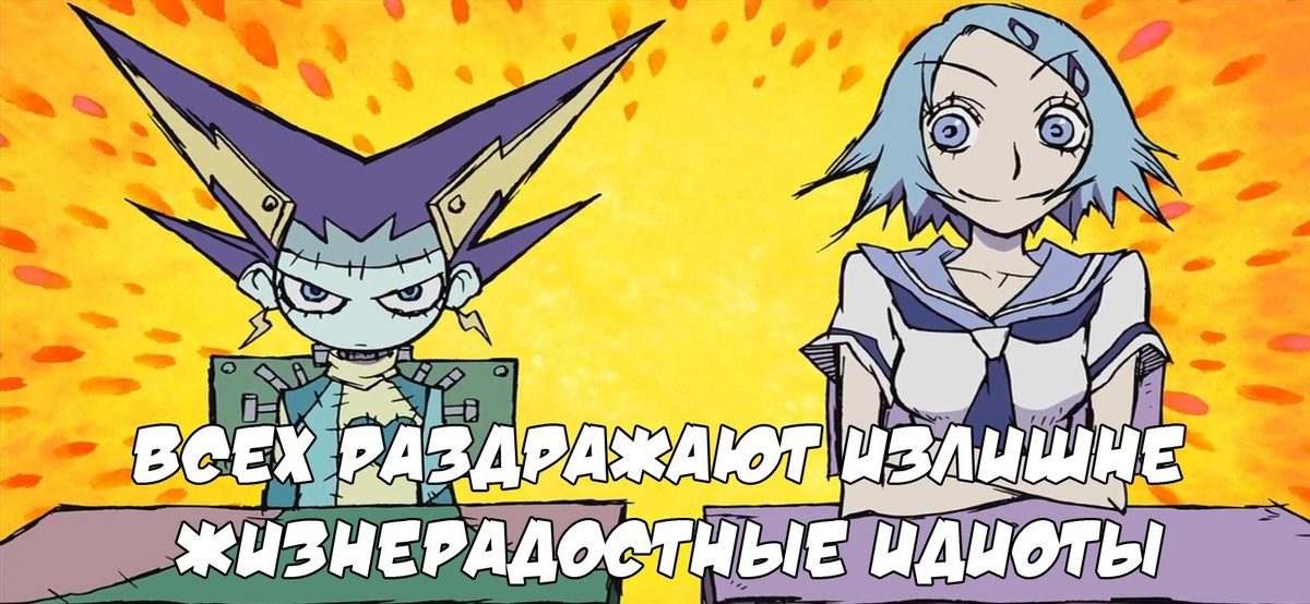 В этом тайтле рисовка, как бы сказать, не самая стандартная. В ней довольно много знакомых черт, скажем так. Тут можно углядеть и Триггер, и его предтечу Гайнакс и, благодаря, так скажем, участию одного известного мужика - Продакшн АйДжи (я говорю конкретно о фильме Мертвые листья и о Хироюки Имаиши). Куча штрихов, куча рваных и ломанных линий, однако, нарисовано все не топорно, а именно в нужном стиле, отчего смотрится - вполне себе органично и глаз, скажем так, радует (если ты, конечно, не вознамерился на кого-то фапать или типа того, хотя...)