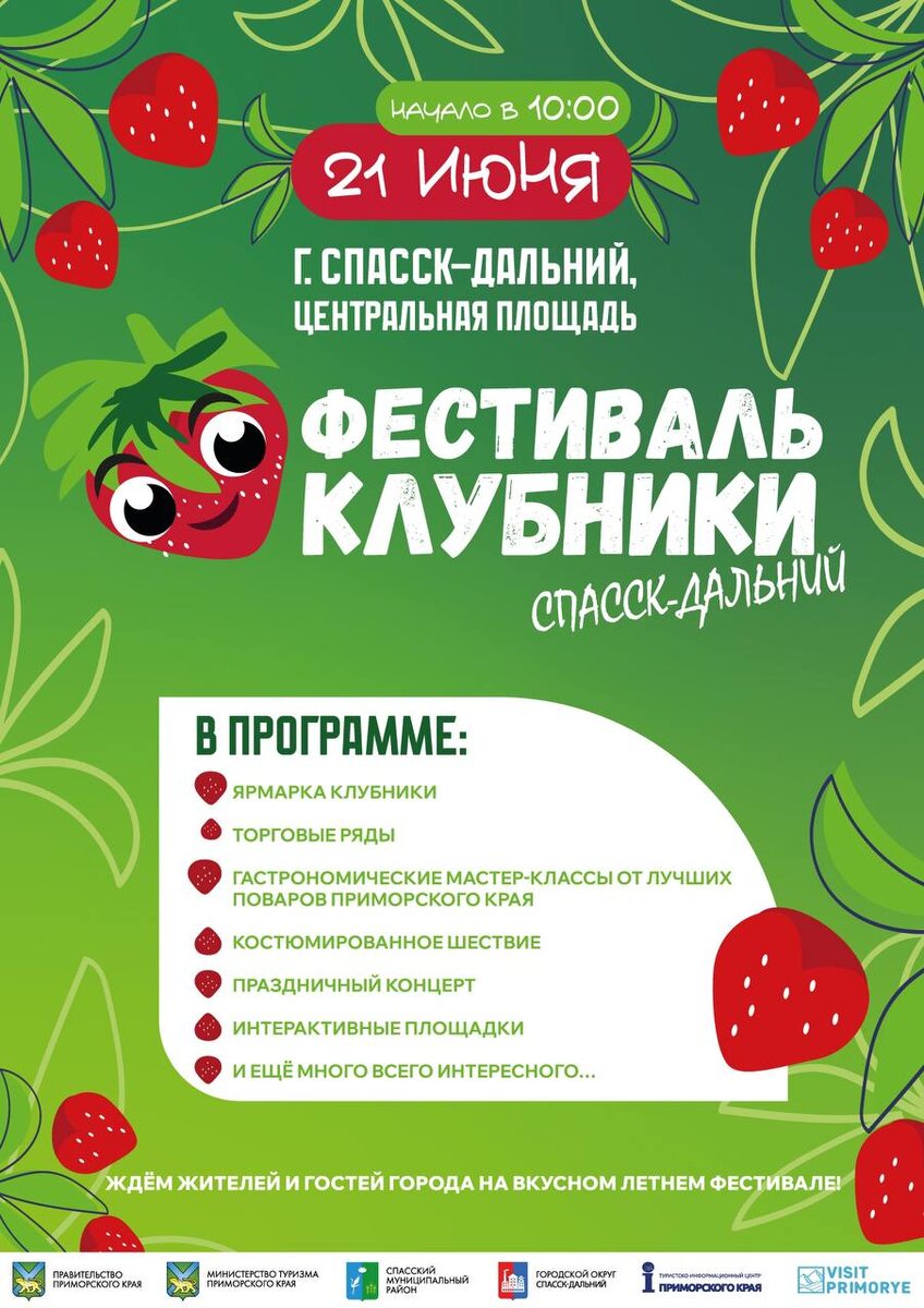 21 июня☀️ МО Спасск-Дальний, центральная площадь Добро пожаловать на самый сладкий праздник лета — фестиваль «Клубничная столица Приморья»!🍓 ✨Вас ждут яркие события и вкуснейшие угощения: - Ярмарка свежей клубники - Торговые ряды местных фермеров и производителей - Гастрономические мастер-классы от лучших шеф-поваров региона - Костюмированное шествие и конкурс костюмов - Праздничный концерт с участием творческих коллективов Приморья - Интерактивные площадки и конкурсы для всей семьи - А также многое другое… 😋 👏Приходите с друзьями и близкими насладиться ароматом лета и попробовать самые сладкие ягоды сезона! 📍Начало в 10 часов. Ждём всех желающих окунуться в атмосферу праздника и веселья! #спасскдальний #спасск24 #КлубничнаяСтолицаПриморья #ФестивальКлубники