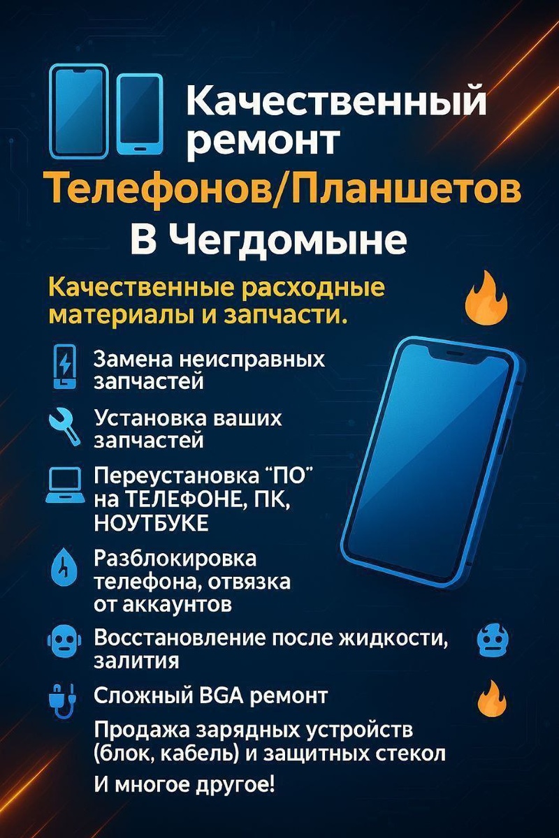⚡Kaчественный рeмонт 🔧🔧 Телефонoв/Планшeтов📲🖥 В Чегдомыне. Качественные расходные материалы и запчасти.🔥 -Замена неисправных запчастей📱💻 -Установка ваших запчастей 🛠 -Переустановка "ПО" на ТЕЛЕФОНЕ, ПК,НОУТБУКЕ💻 -Разблокировка телефона, отвязка от аккаунтов (iClоud,Google,Samsung account) -Восстановление после жидкости, залития 💧⚡ -Сложный BGA ремонт🤖 -Продажа зарядных устройств(блок,кабель) и защитных стекол на ваше устройство🔥 -И многое другое! WHATSAPP: 89142181230 —-------------------- В наличии гидрогелевая плёнка на любое устройство 🔥 Матовая-700р Глянец-800р Матовая пленка-антишпион-1000р Пленка+наклейка😍🔥 Для заказа писать,WhatsApp:89142181230 За рекламой сюда👉 @ANN2222000