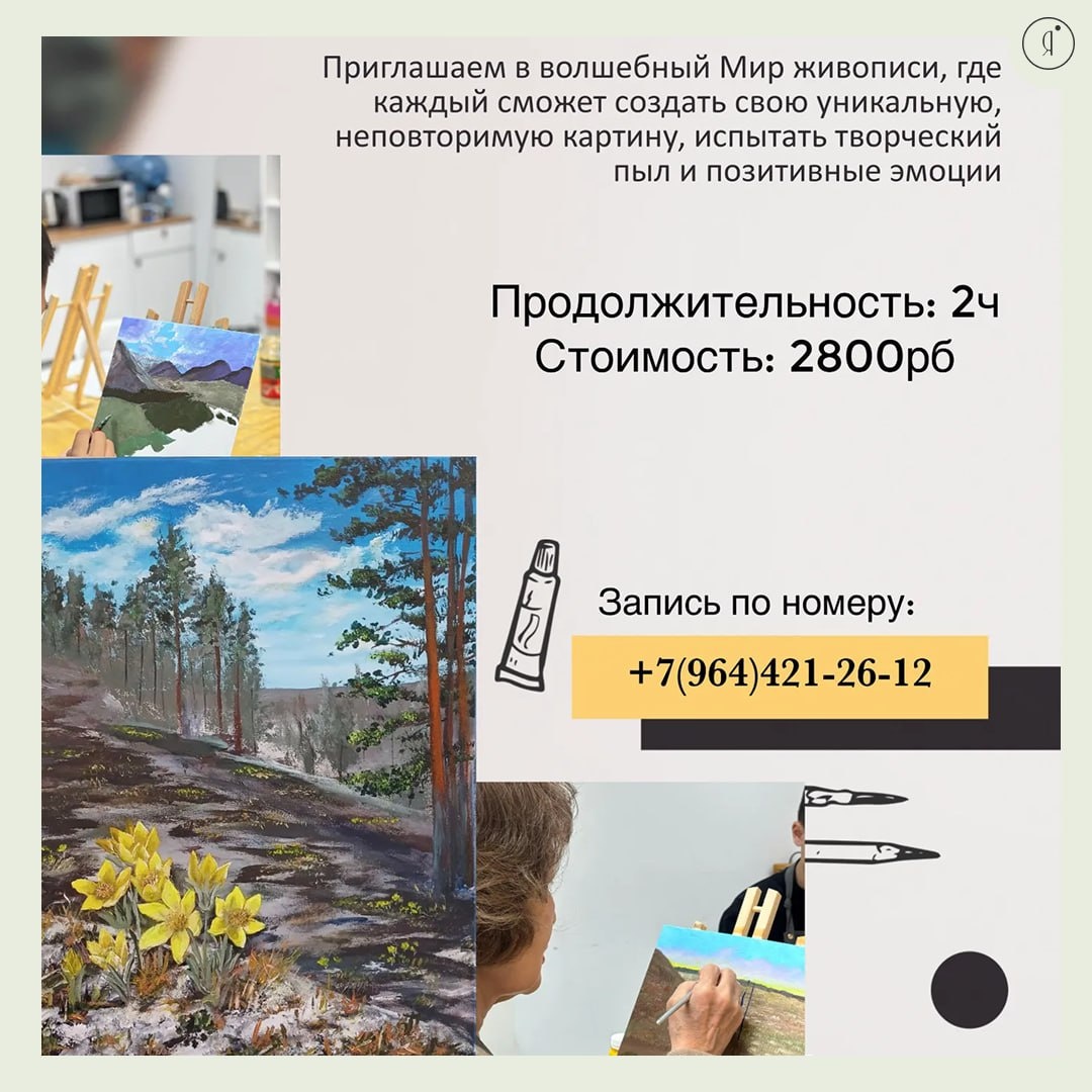 «Оживим холст» #МК На мастер-классе вы сможете отдохнуть душой, раскрыть свои таланты и получить массу позитивных эмоций! В ходе занятия вы: - Освоите основы живописи и различные техники рисования. - Погрузитесь в атмосферу творчества и вдохновения. - Создадите собственное произведение искусства, которым сможете гордиться! Продолжительность: 2-3 часа CREATIVE LAB, Ойунского, 8г 2800 руб. По записи: +79644212612 Online Якутия | Подписаться