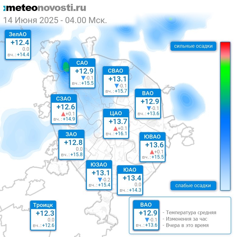 В 4:00 в Москве было от +12.1°C до +13.9°C, средняя температура +13°C #погода #Москва #лето #температура #14июня #суббота