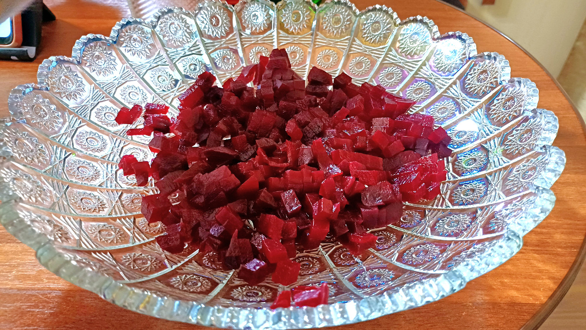 Всем привет! У нас сегодня винегрет😋 Нами любимый рецепт👍 Очень много вариантов приготовления винегрета,но нам нравится именно этот. Делюсь с вами,как готовим его мы. Варёную свёклу режем кубиком. Варёный катрофель так же режем кубиком. Варёную морковь нарезаем так же. Далее репчатый лук мелко режем. Добавляем банку консервированного зелёного горошка. Маринованные огурцы режем кубиком и отправляем в салат. Добавляем ароматное подсолнечное масло и немного соли. Всё перемешиваем и салат готов. Вкуснота и красота👍😋 Приятного аппетита! Всем хорошего дня и отличного настроения!🤗