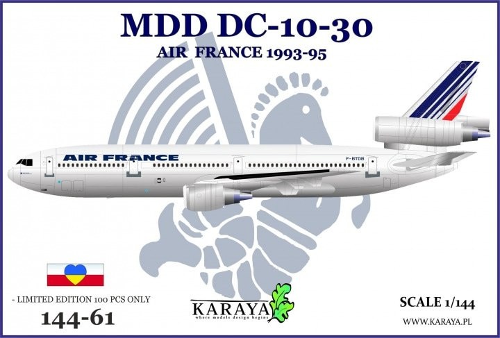 Karaya из Польши переиздает с новой декалью модель разработки "Восточного Экспресса" 2019 года MDD DC-10-30 в масштабе 1/144: MDD DC-10-30 Air France 1993-95 (каталожный номер 144-61)