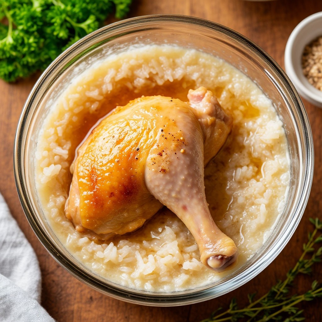 Расскажу об очень простом рецепте, который работает всегда, как палочка-выручалочка. Сегодня я поделюсь с вами секретом приготовления невероятно вкусного ужина, где каждый ингредиент играет свою особенную роль. Представьте: нежный рис, пропитанный мясным соком, и сочная курица сверху – настоящее гастрономическое удовольствие! * 1 куриный окорочок или 3 голени (по желанию без кожи) * 1 стакан риса (длиннозёрный, лучше пропаренный) * 2 стакана воды (кипятка) * Щепотка соли * 1 лавровый листик * Чёрный перец по вкусу 1. В стеклянную посуду для микроволновки на дно выложите промытый рис 2. Залейте рис двумя стаканами воды 3. Посолите, добавьте лавровый листик и поперчите 4. Сверху аккуратно выложите курочку 5. 5 минут на полной мощности – и волшебный аромат уже витает в воздухе! 6. Затем 25 минут на мощности 50% – и блюдо готово к подаче Магия вкуса: Благодаря тому, что курица лежит поверх риса, все её соки естественным образом пропитывают крупу, делая её невероятно ароматной и насыщен