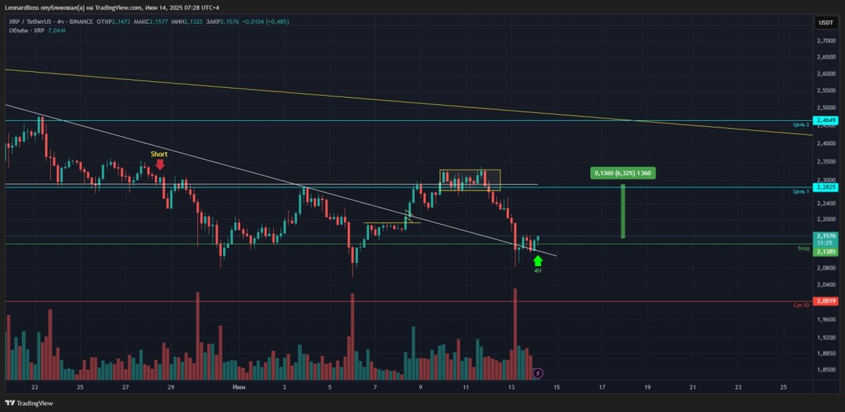 #XRP 🔼🔼🔼 ⚠️Сделка выходного дня. Открылся с х3 плечом. Рынок успокоился, сверх мощных движений не жду, при этом короткие медленный отскоки будут продолжаться. Актив слабо волатилен, в том числе поэтому использую плечо, говоря именно о текущей ситуации!! P.s. да, есть опасность получить по рынку финальные сквизы, при этом спустя сутки я вижу сильнейший страх и отсутствие маржинальных покупок, в противном случае, мы бы уже увидели пару выходов в обе стороны. Вот этой ситуацией я и хочу воспользоваться. Сделка в сопровождении руками, поэтому без стопа. Зона уровня 2,1$ достаточно хорошо отрабатывала ранее, посмотрим справится ли сейчас?!