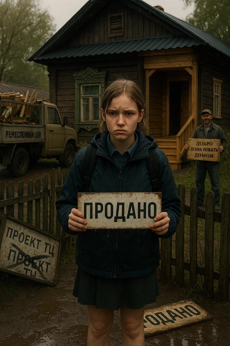 В одну промозглую среду, когда на улице раскис первый мартовский снег, семиклассницу встретило зрелище похлеще школьных тестов: на старых распахнутых воротах красовалась свежая бело-красная табличка «ПРОДАНО». Она болталась на гвозде, будто чужое ухо, подслушивающее испуганные мысли. Маша уронила рюкзак, распустила шнурки и минуту стояла, как примерзшая к тротуару кукла.