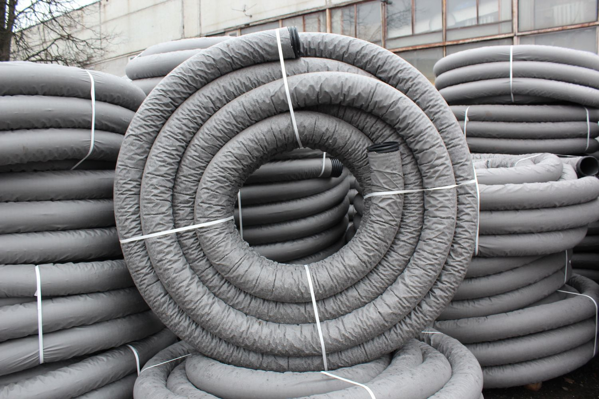Дренажные трубы — это специализированные изделия, предназначенные для сбора и отвода излишков грунтовых или поверхностных вод. Они укладываются в траншеи с песчано-гравийной подсыпкой и покрываются слоем геотекстиля, который предотвращает заиливание системы.