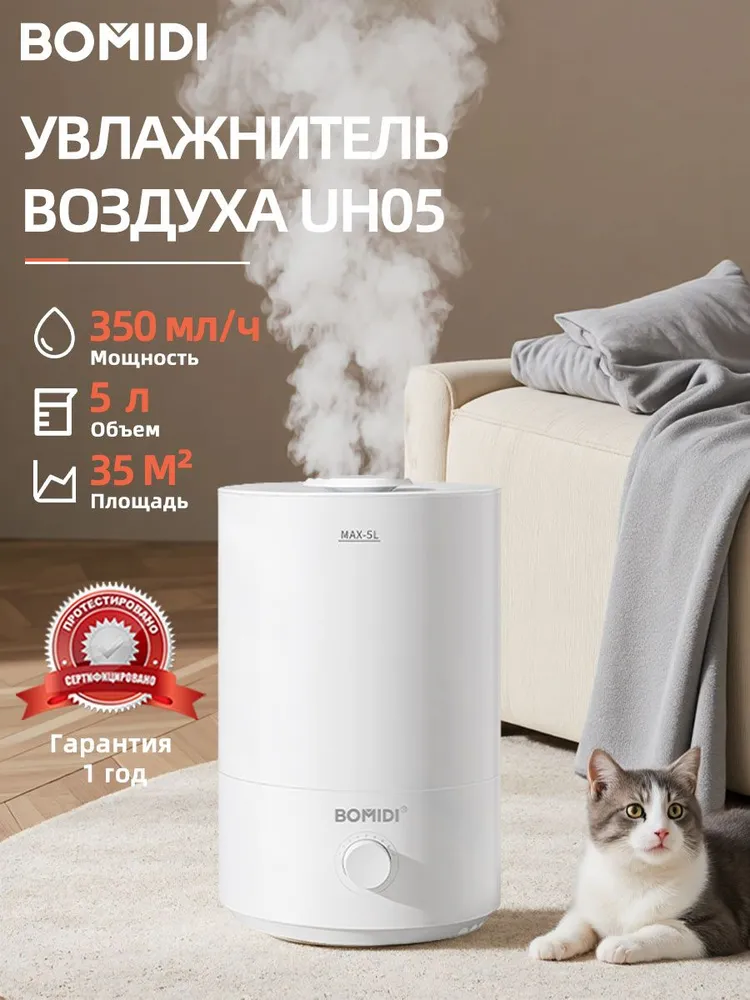 Увлажнитель воздуха Bomidi UH05 создаст идеальный микроклимат у вас дома. Оптимальная влажность в квартире играет большую роль в здоровье человека. Климатическая бытовая техника от бренда Bomidi позволяет поддерживать комфортный уровень влажности воздуха. Огромный плюс увлажнителя – резервуар для воды объемом 5000 мл (5л), а также система заливки воды. Для того, чтобы залить воду достаточно просто ее залить в резервуар, не снимая крышки и не отключая прибор от сети питания. Этот процесс делает работу с увлажнителем легкой и простой. Интенсивность 350 мл/час, что гарантирует вам эффективное увлажнение всего помещения. Время непрерывной работы 35 часов при полном баке. На корпусе предусмотрена кнопка регулировки режимами. Выберите подходящий для вас режим одним движением руки. Режимы: мягкий, средний и интенсивный. Увлажнитель уменьшает влияние сухого воздуха на кожу, слизистую глаз и носа. В отличие от других моделей, данный увлажнитель воздуха работает почти бесшумно. Фильтр задерживает загрязнения и предотвращает засорение и скопление пыли и бактерий. Увлажнитель воздуха Bomidi UH05 станет отличным подарком на новый год, 8 марта, 23 февраля или день рождения вашим друзьям, коллегам и любимым людям. Гарантия 1 год. Рабочая частота у ультразвукового элемента 50 - 60 Гц.