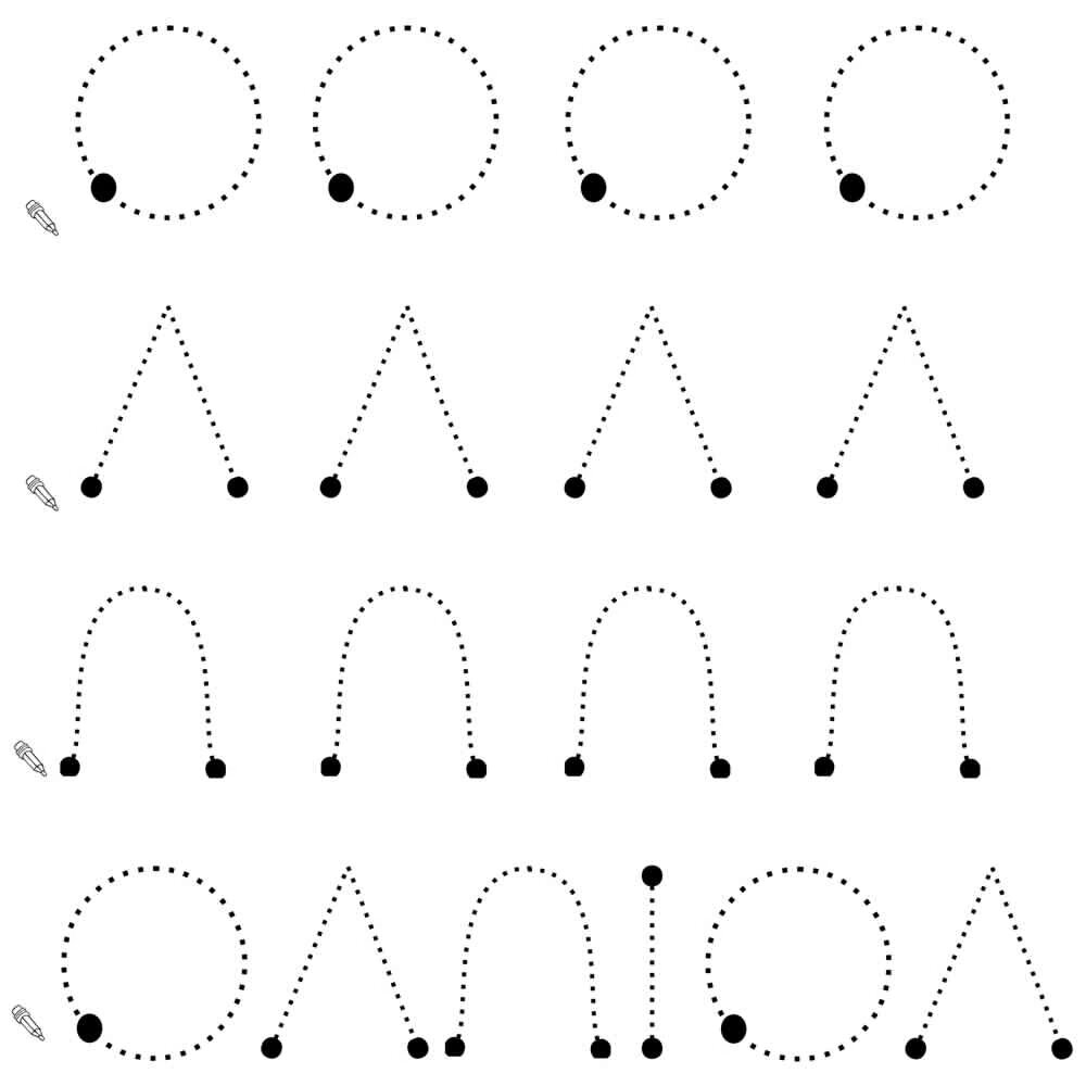 2. Простота – залог успеха! Первые задания – это прямые линии, соединяющие 2-3 крупные точки на небольшом расстоянии. Потом – ломаные линии, простые геометрические фигуры (квадрат, треугольник). Только затем – кривые, овалы и предметные рисунки.