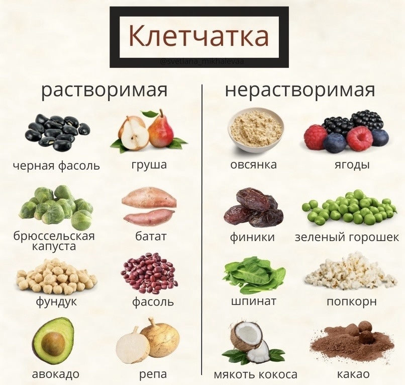 - Растворимая: Растворяется в воде, образуя гелеобразную массу. Помогает снижать уровень холестерина и контролировать уровень сахара в крови. Содержится в овсянке, яблоках, цитрусовых, бобовых.