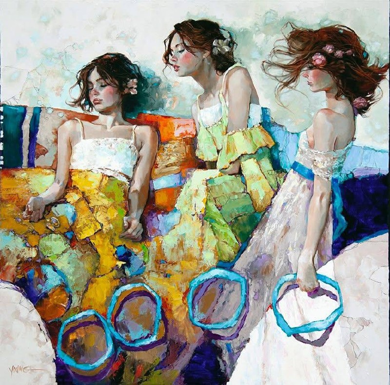 Глядя на картины Донны Янг, будто погружаешься в кадры из нового модного сериала «Сирены» — те же переливы света на воде, глубина оттенков, красивые наряды и тревожная красота.