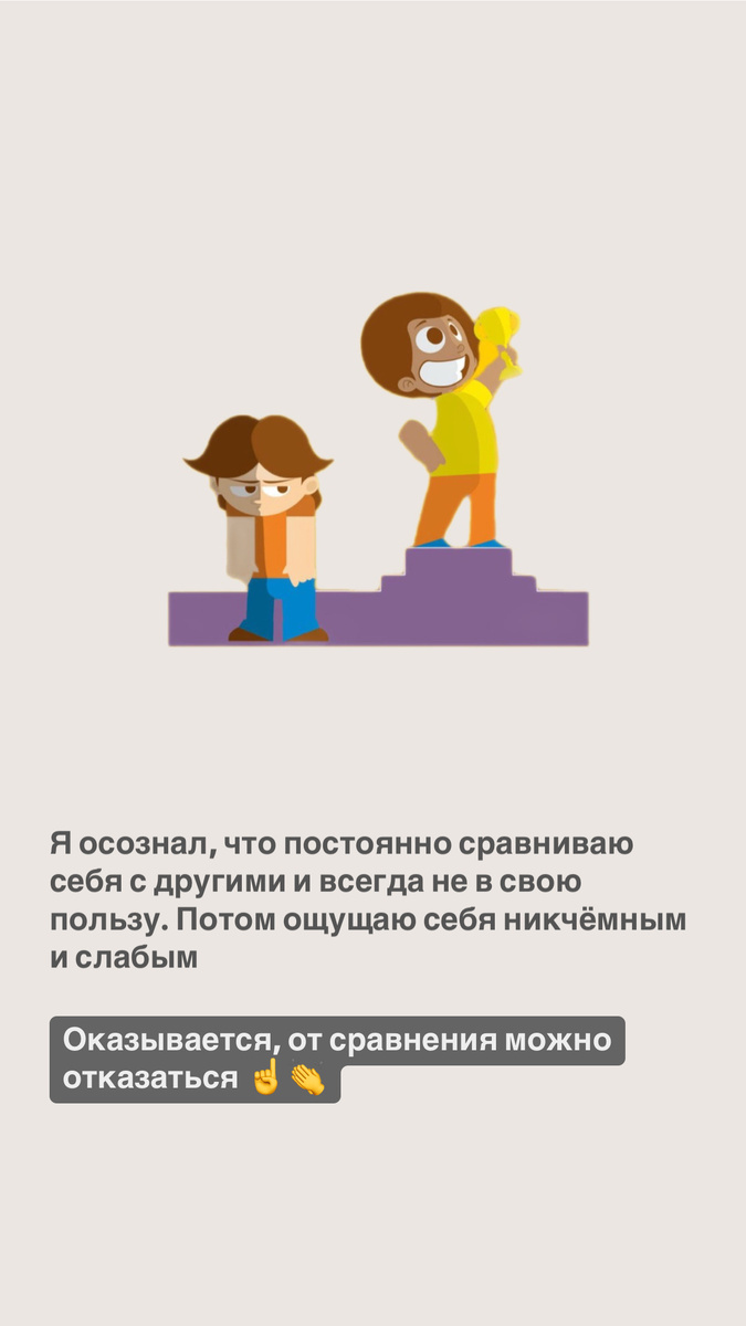 - *Я осознал, что постоянно сравниваю себя с другими и всегда не в свою пользу. Потом ощущаю себя никчёмным и слабым. Оказывается, от сравнения можно отказаться.*