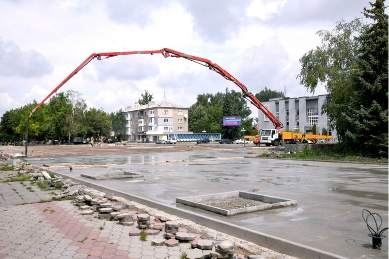 🚧 Вот такая спецтехника применяется в Свердловске для заливки 5 тысяч квадратных метров площади Мира в бетон