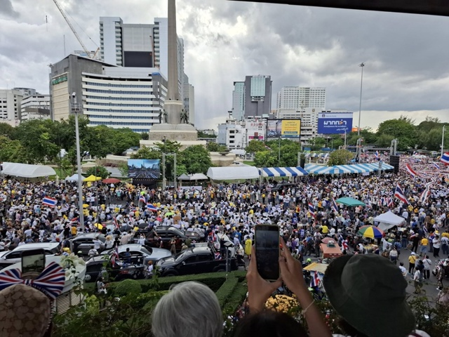 На митинге звучат буддийские мантры, а участники уверяют, что собираются продолжать мероприятие до самой ночи. По состоянию на 13:15, площадь была заполнена лишь наполовину, но ожидается, что количество участников будет расти. Люди приходят с флагами Таиланда и в формах, символизируя свою приверженность суверенитету страны.