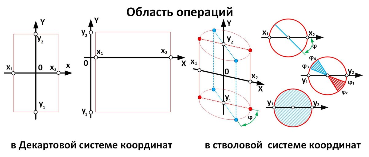 Частным случаем является область операций, определяемая в прямоугольной (Декартовой) системе координат, при этом границами области операций (значениями Х₁, Х₂, Y₁, Y₂, см. рисунок ниже) могут быть любые вещественные числа. В общим случае область операций задается в стволовой системе координат (3), напоминающей цилиндрическую, но имеющую от нее отличия. Кроме значений Х. Y задается азимут ϕ, в градусах 0 ≤ ϕ < 360°; или радианах 0 ≤ ϕ < 2π.
