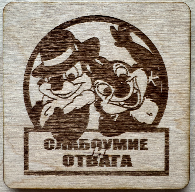 Деревянная подставка для кружки с лазерной гравировкой изображения Чип и Дейл "Слабоумие и отвага" покрытая лаком в 2 слоя.