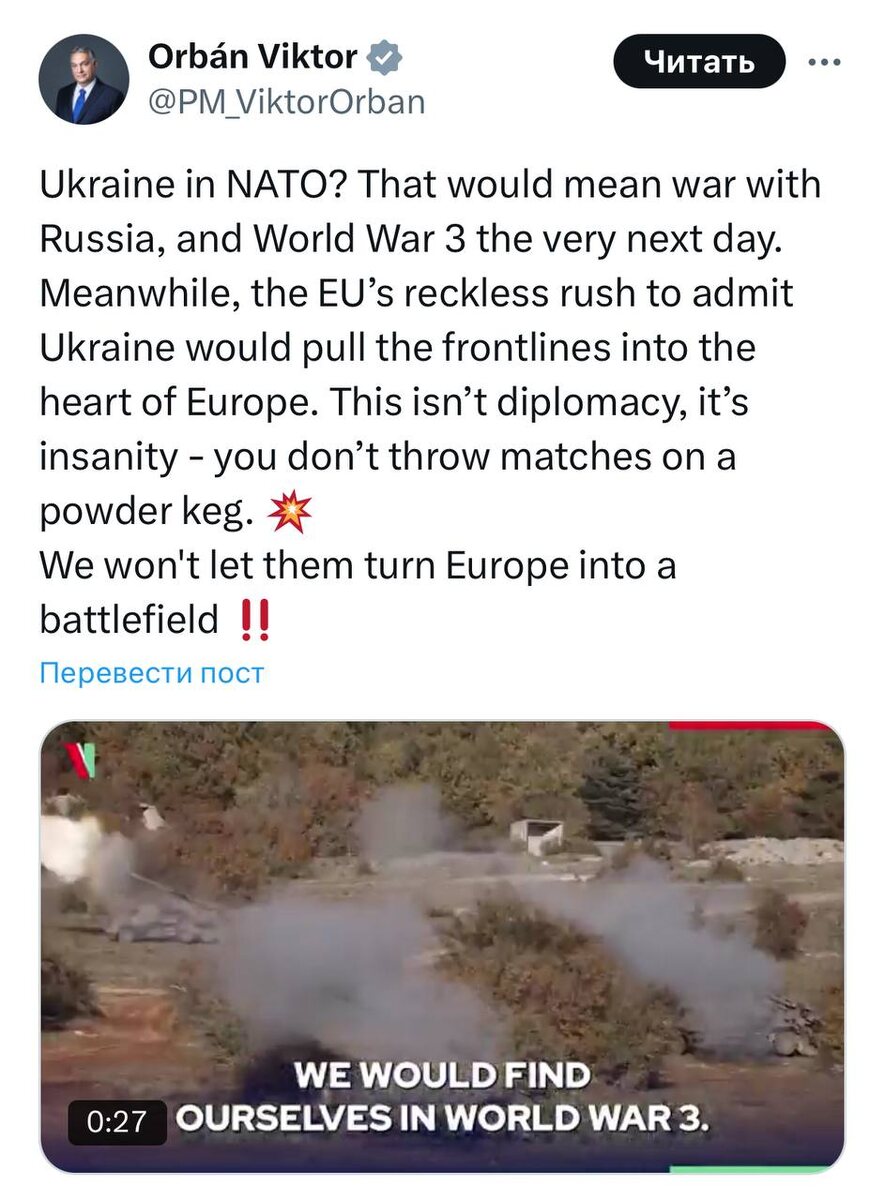 🇭🇺 Премьер Венгрии Виктор Орбан на платформе X заявил: Украина в НАТО? Это означало бы войну с Россией и Третью мировую уже на следующий день. Тем временем безрассудная спешка ЕС принять Украину втянет линию фронта в самое сердце Европы. Это не дипломатия, это безумие — спички не бросают в бочку с порохом. #этимвсесказано 🚲 Подпишись на Телега Online