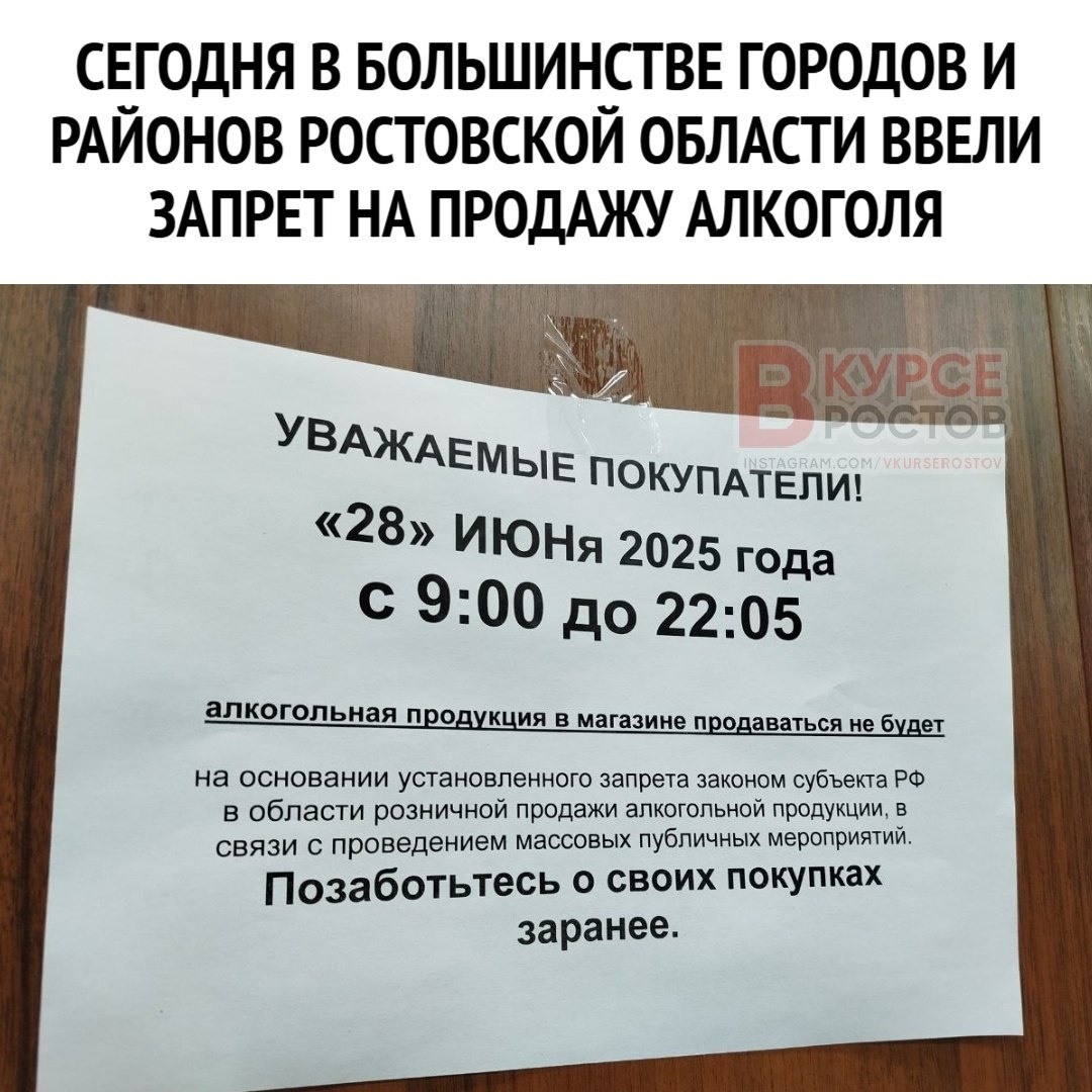 Напоминаем, что сегодня в большинстве городов и районов Ростовской области ввели запрет на продажу алкоголя