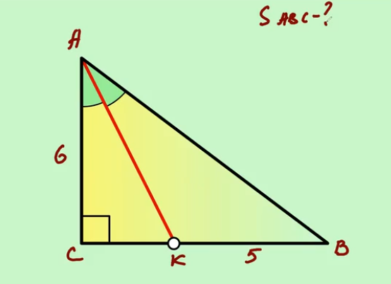 На канале Валерия Казакова Наглядная геометрия помещена задача под заголовком «Должен уметь каждый!» 1. В прямоугольном треугольнике ABC с прямым углом C проведена биссектриса AK. Найдите площадь этого треугольника, если AC = 6, KB = 5. Решение, показанное ведущим канала, в заключительном кадре выглядит так. Источник. Должен уметь каждый! | Наглядная геометрия | Дзен. https://yandex.ru/video/preview/13180820867544490776 Здесь применена формула тангенса двойного угла, что делает решение недоступным для школьников ранее старших классов. А задача имеет более простое решение, доступное восьмиклассникам. Решение. Обозначим CK = x и выразим через x гипотенузу AB при помощи свойства биссектрисы. В этом месте есть два способа решения уравнения. В левой части уравнения функция положительного x возрастает, в правой части убывает, поэтому уравнение имеет не более одного корня. Число 3 является единственным корнем уравнения. В нашем «детском» решении использовано свойство биссектрисы треугольника,