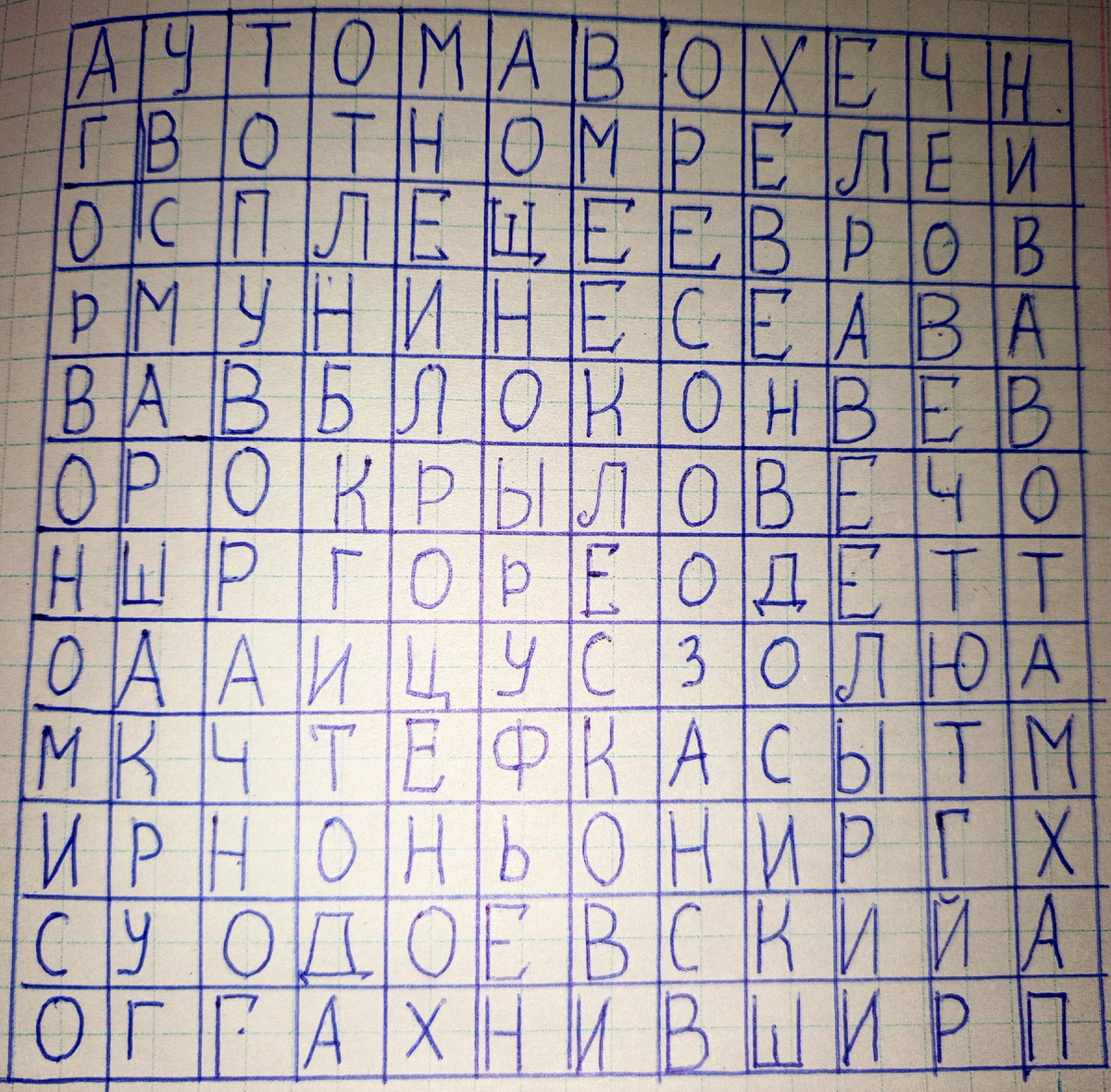 Здравствуйте... Предлагаю вашему вниманию ответы игру "Сетка". В ней были зашифрованы известные писатели и поэты. Ваша задача была, найти их. Слова шли прямо, обратно, вверх, вниз. Вам понравилась игра? Кто-то вспомнил любимых поэтов, писателей, их произведения. Возможно, это навеяло воспоминания, о школе, о юности. Пришвин Одоевский Ахматова Тютчев Фет Маршак Симонов Лермонтов Плещеев Есенин Блок Крылов Лесков Гончаров Рылеев Бунин