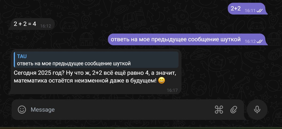 Больше никакой путаницы в диалогах — ваш бот может точно указывать, на какое сообщение он отвечает, используя систему меток message_id. Просто добавьте инструкцию в промпт, и бот начнет поддерживать контекстный диалог как профессионал.
